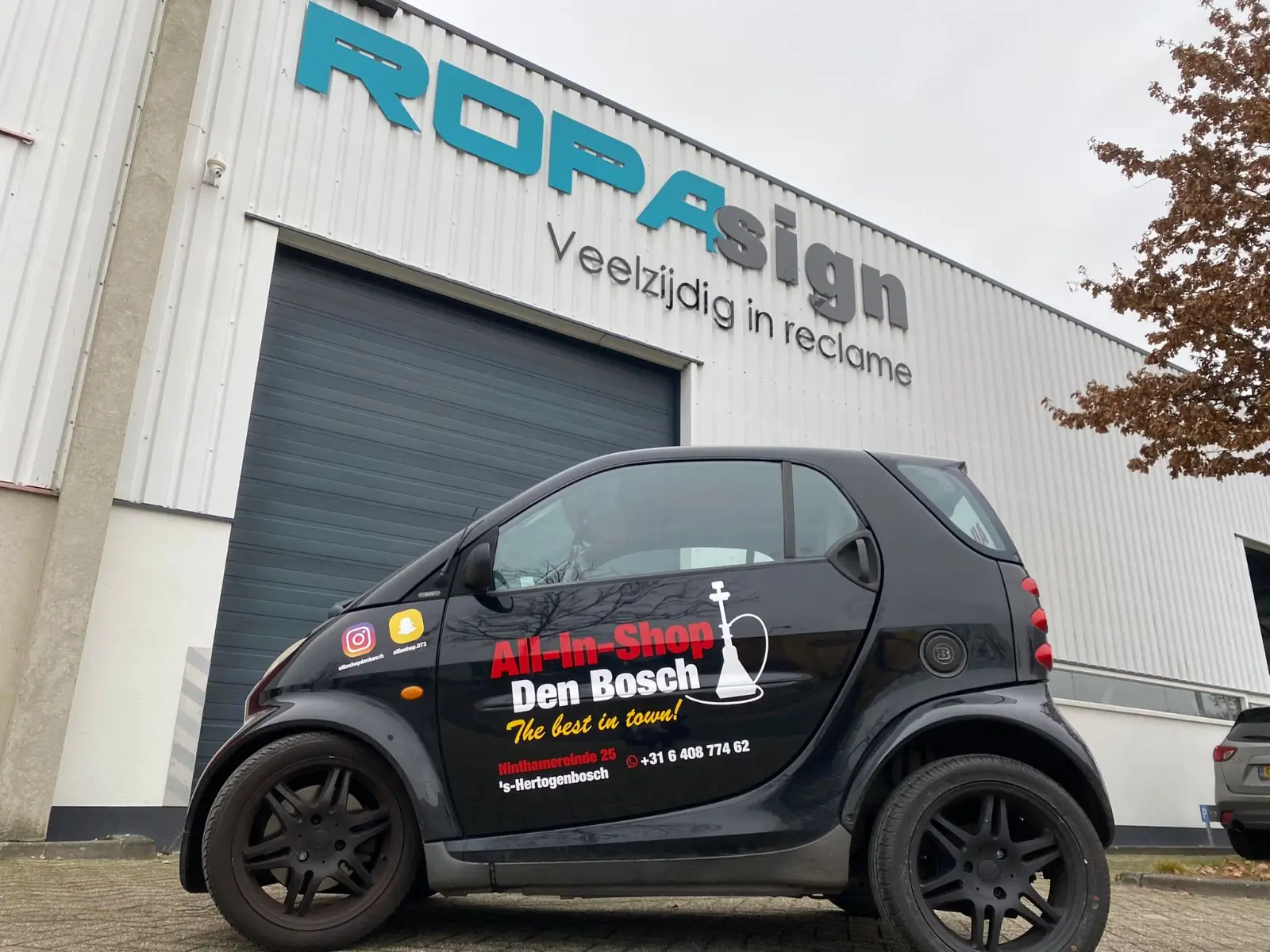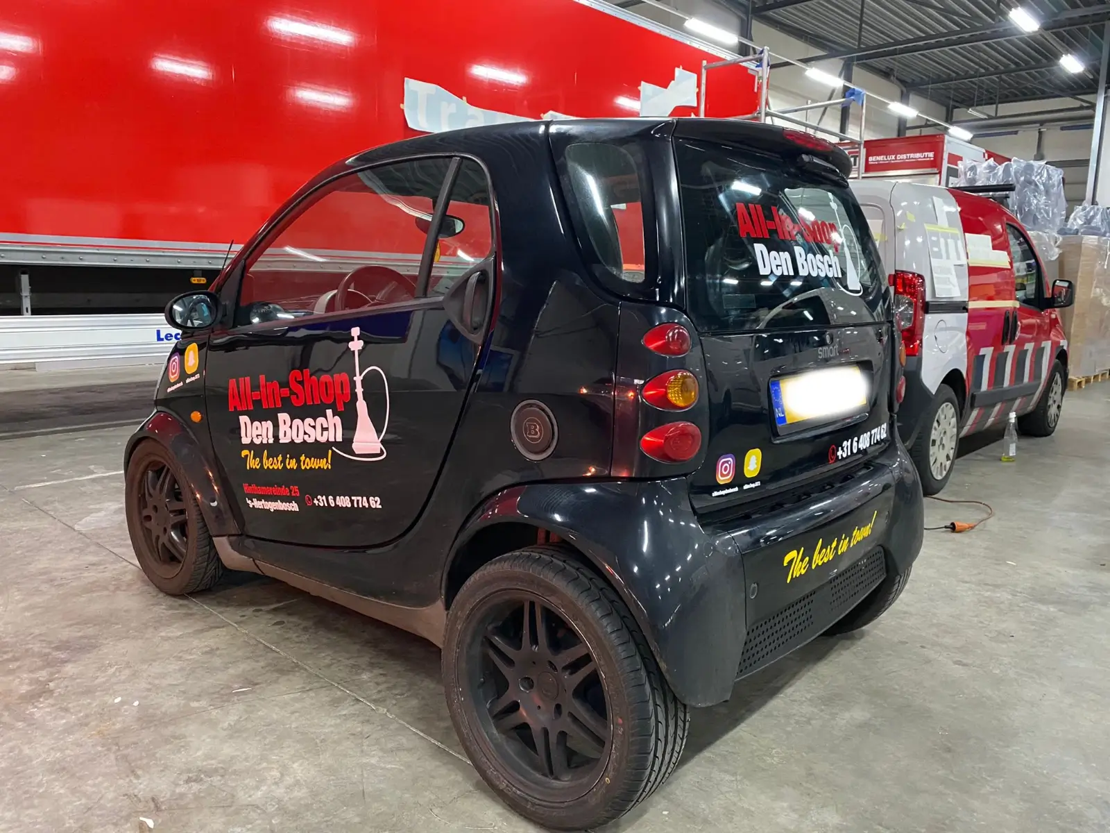 De auto van All-In shop Den Bosch heeft een gloednieuwe look dankzij de opvallende belettering die niet alleen de aandacht trekt, maar ook het merk versterkt.