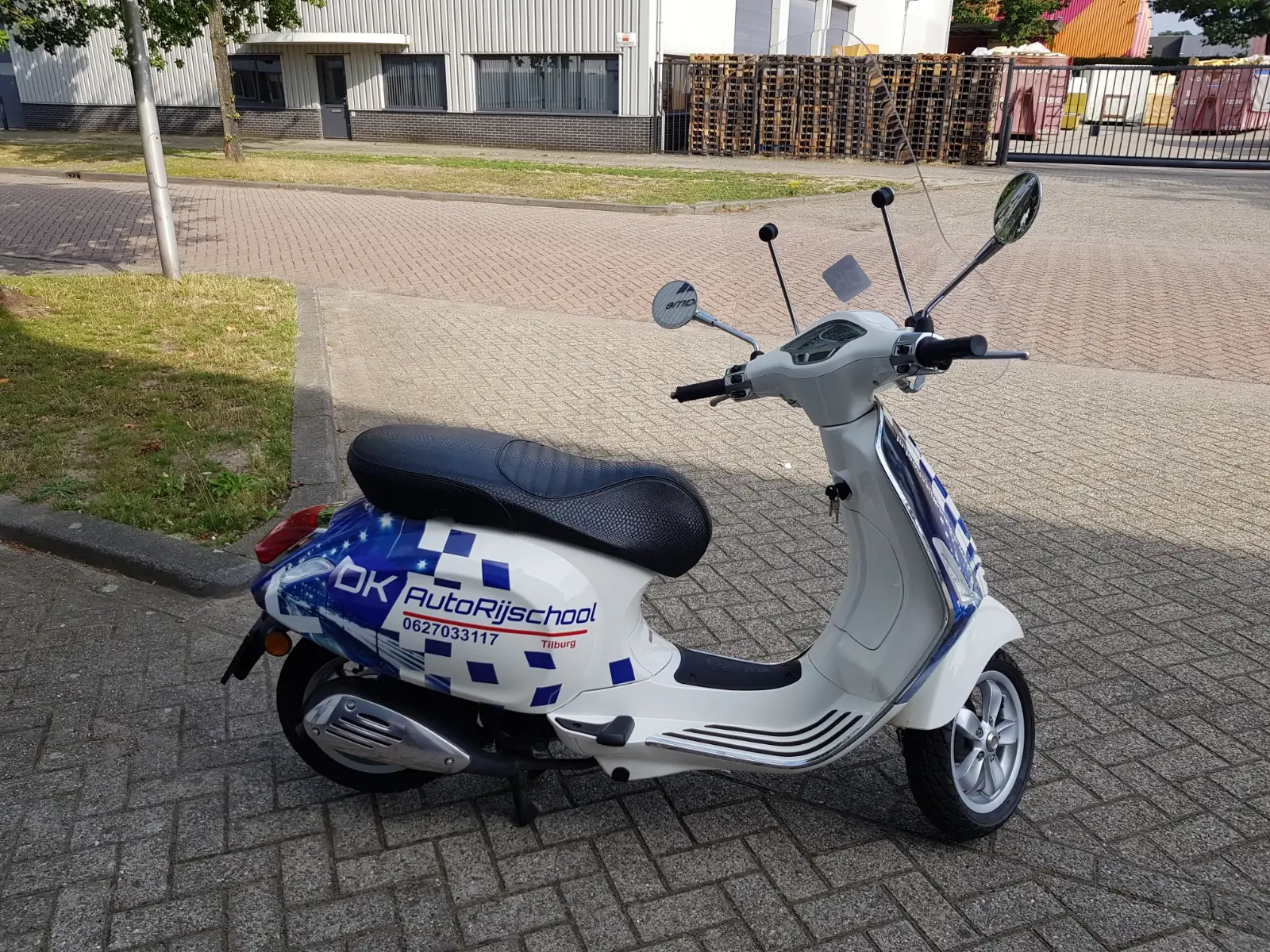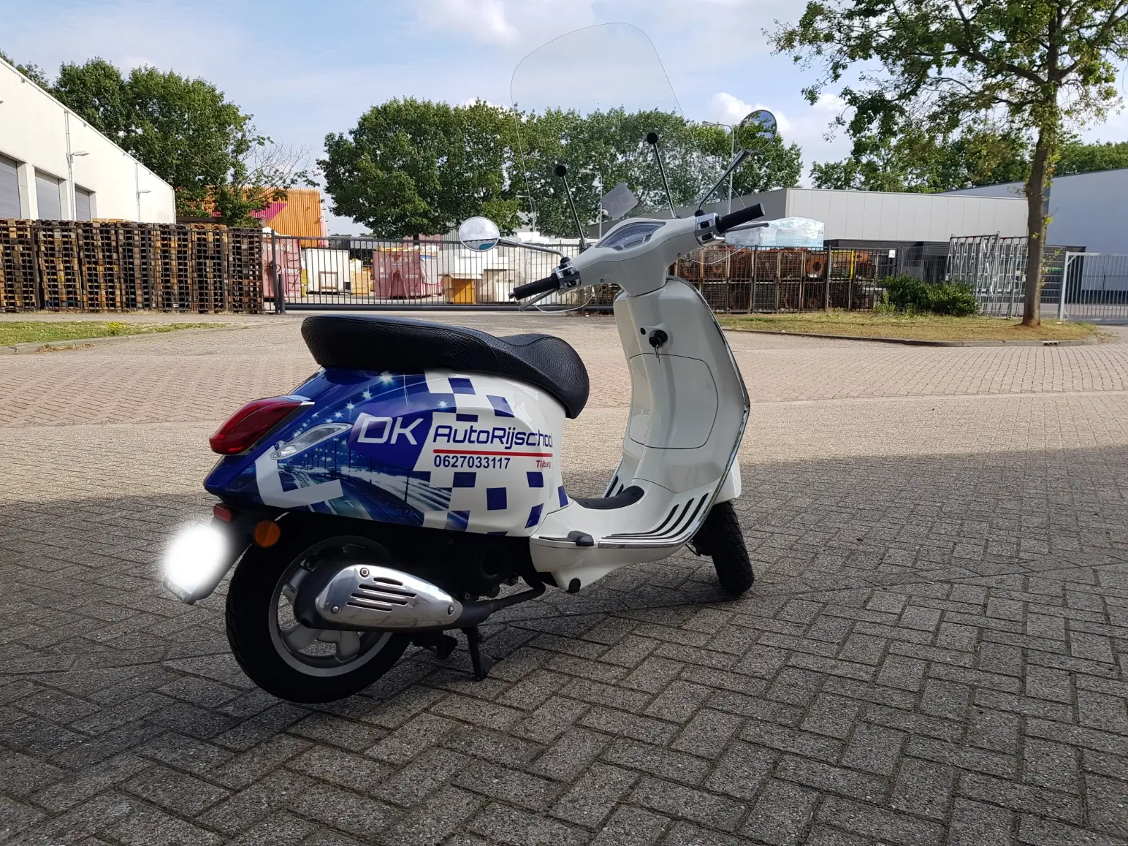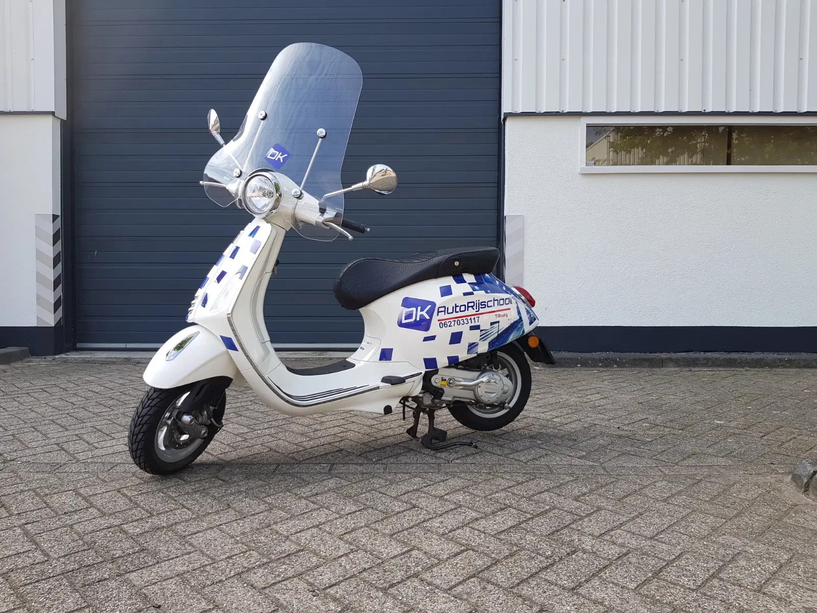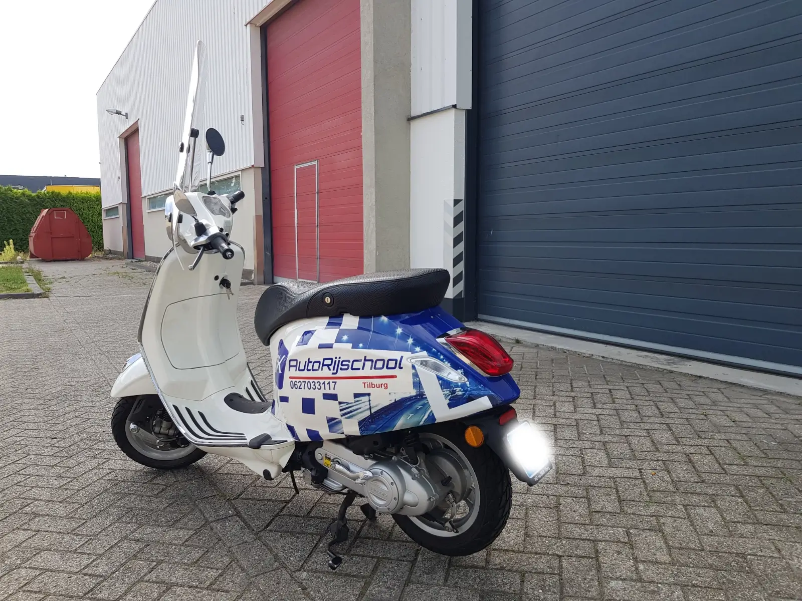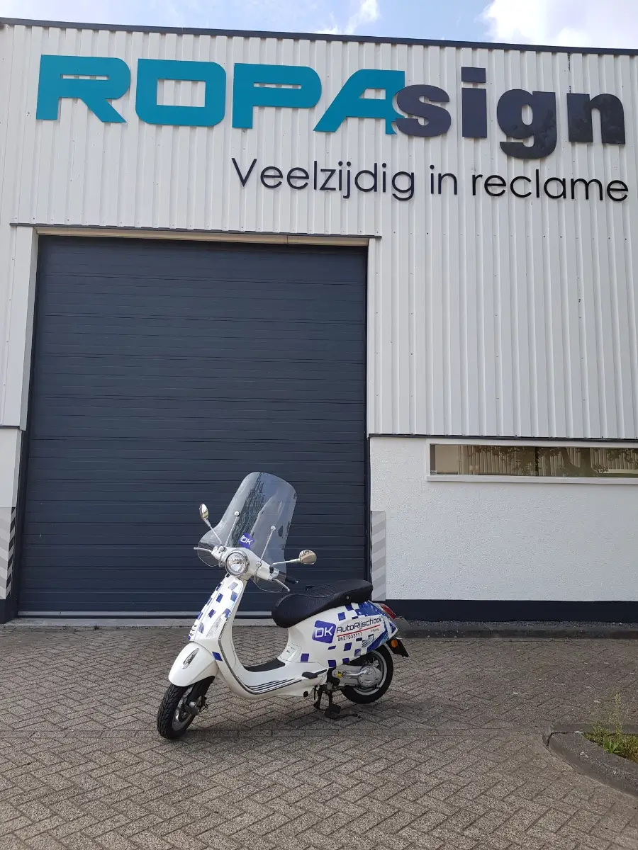 De scooter van DK Autorijschool heeft een gloednieuwe look dankzij de opvallende belettering die niet alleen de aandacht trekt, maar ook het merk versterkt.