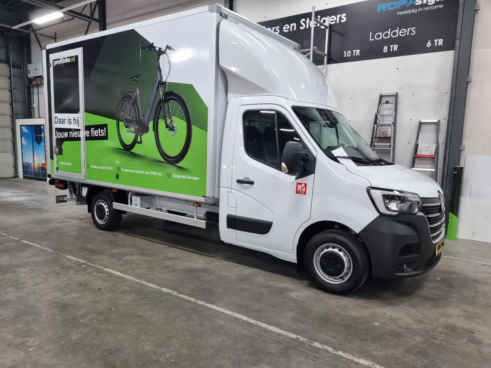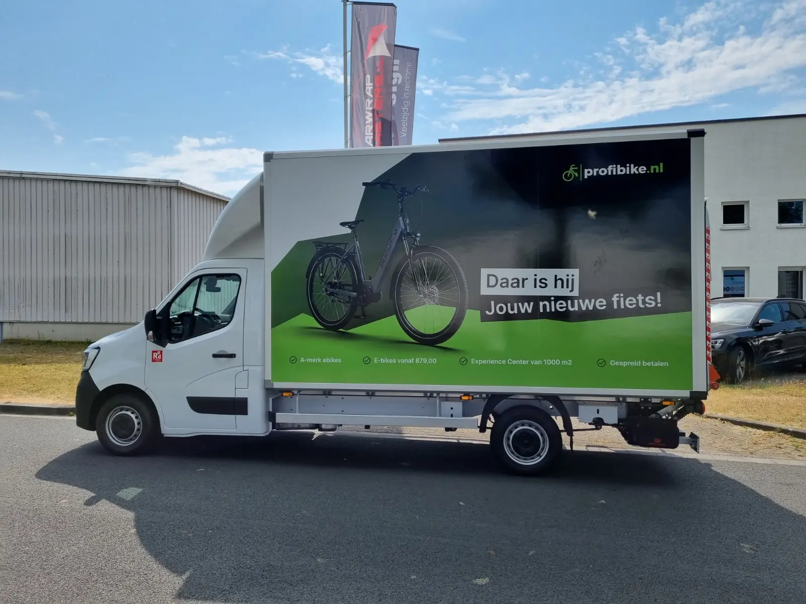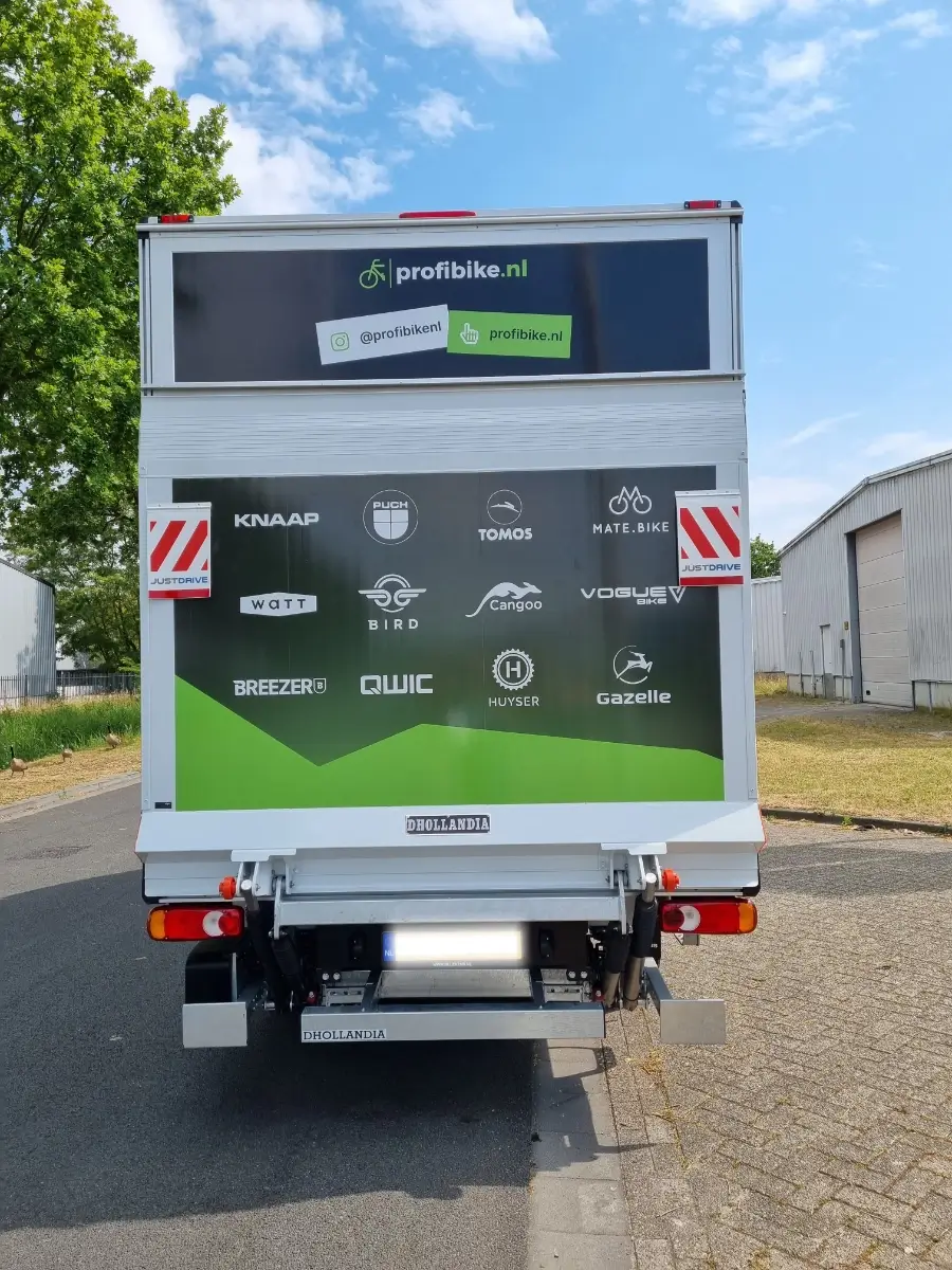 De bakwagen van DutchEbike heeft een gloednieuwe look dankzij de opvallende belettering die niet alleen de aandacht trekt, maar ook het merk versterkt.