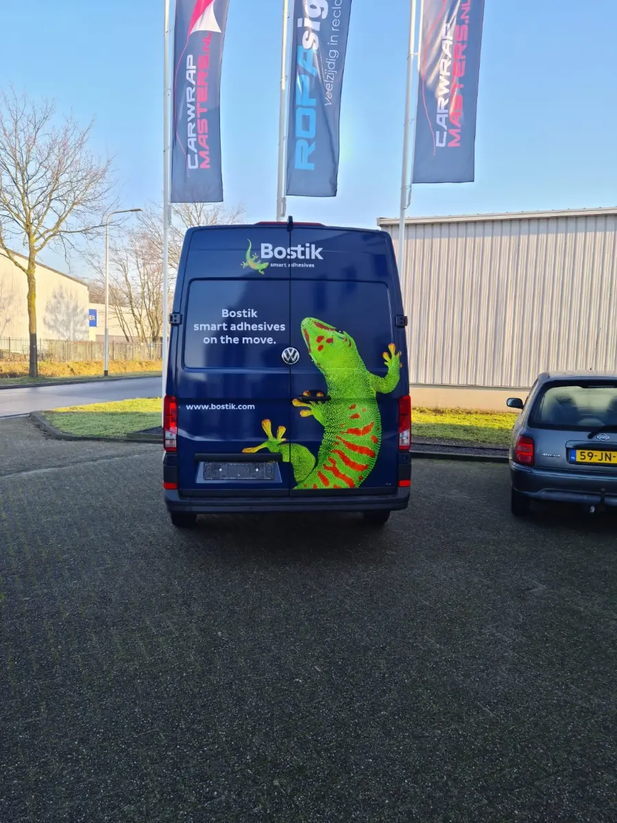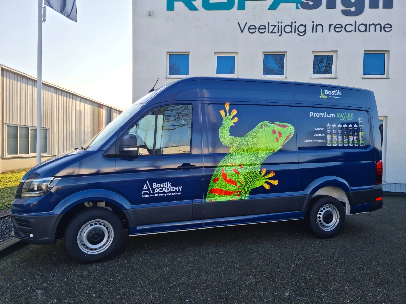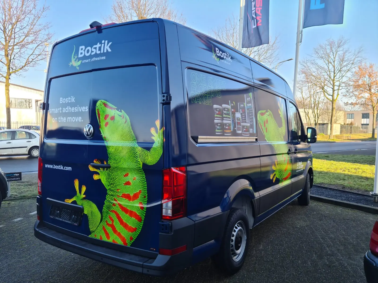 De nieuwe full colour print op de VW Crafter van Bostik trekken de aandacht, maar versterken ook het doel.
