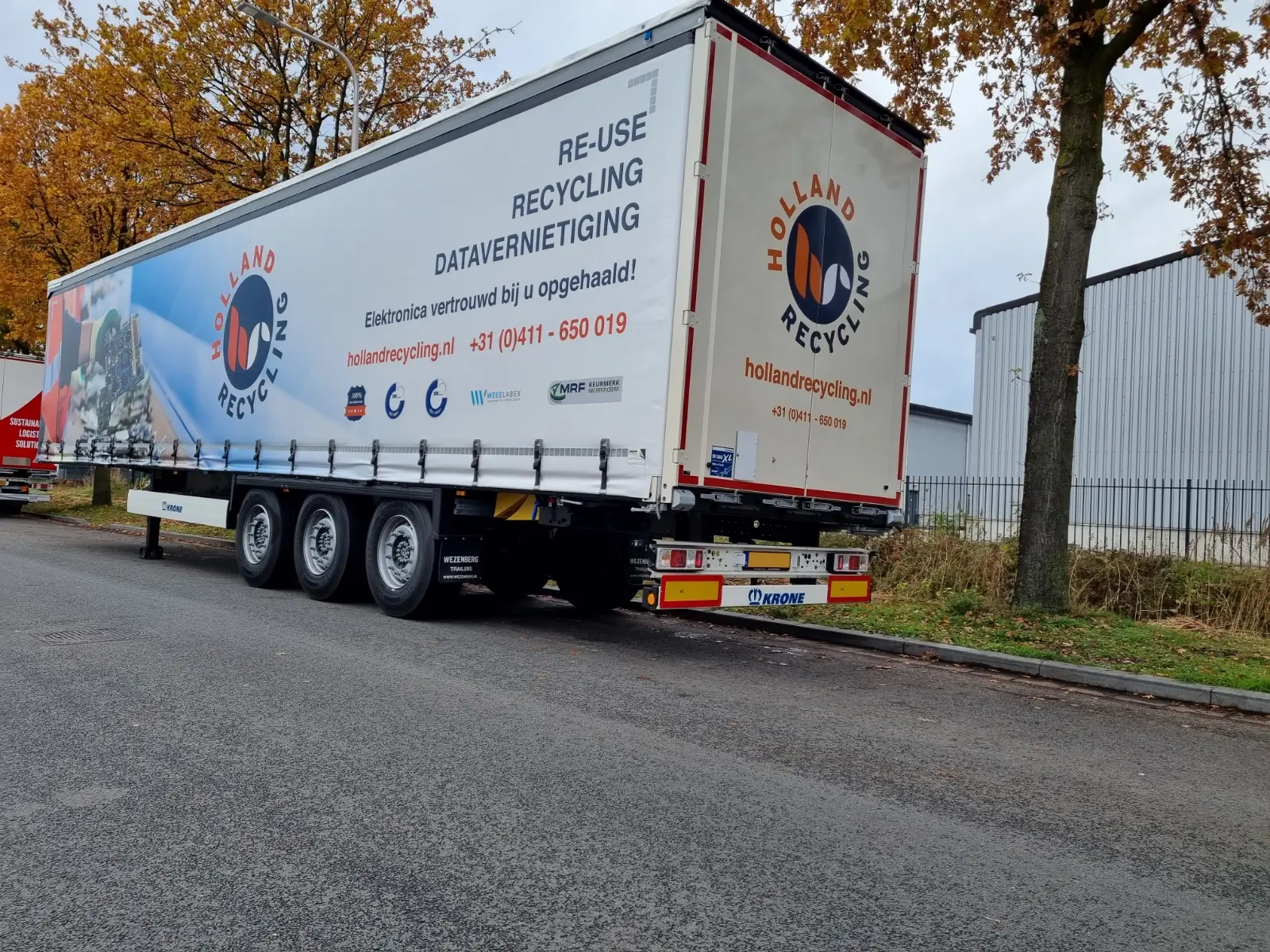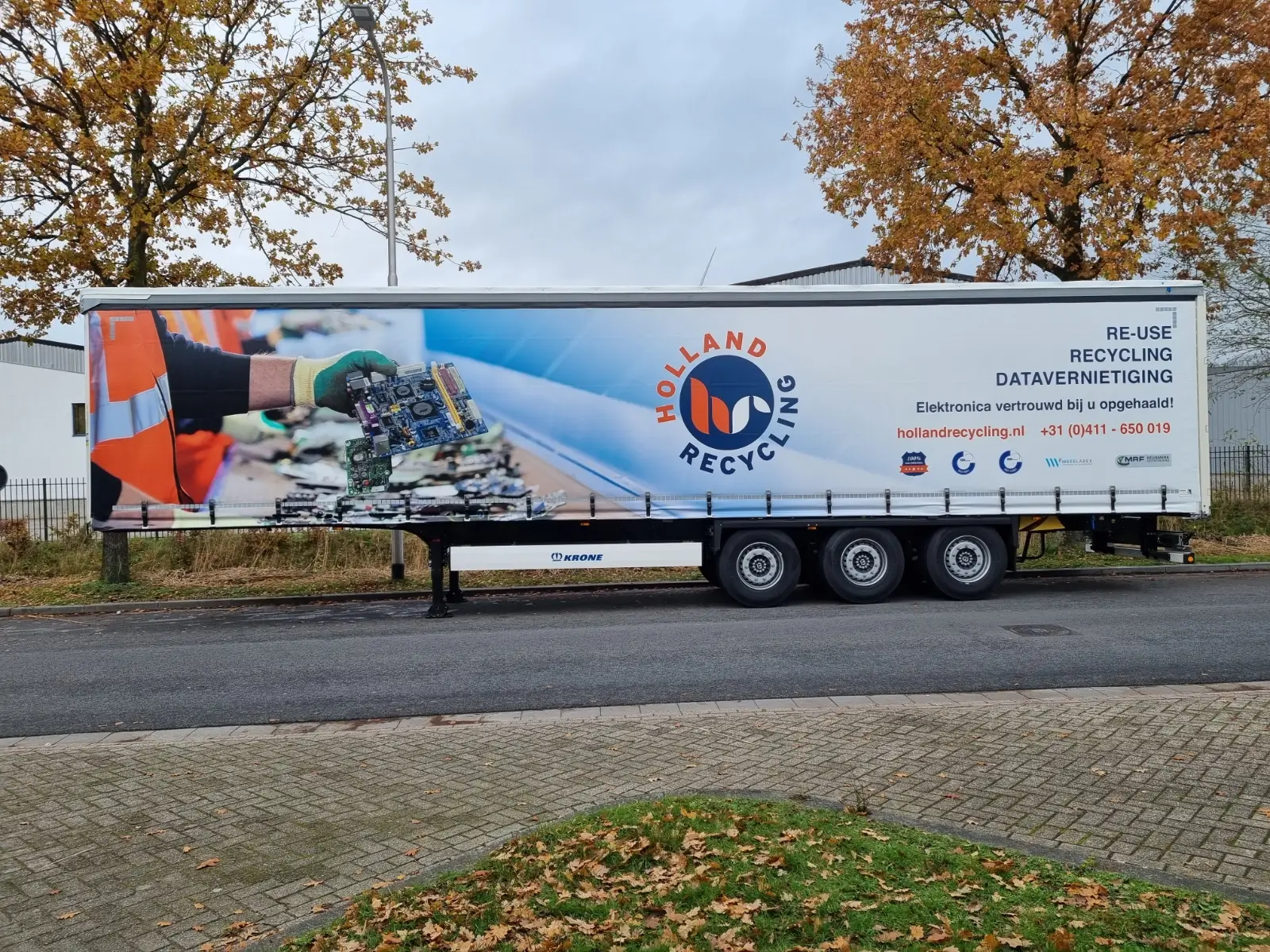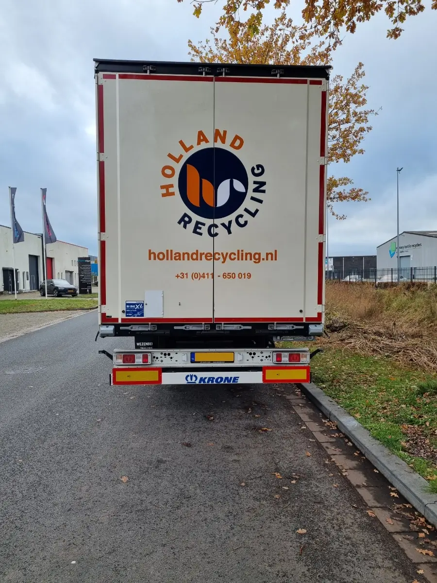 De oplegger van Holland Recycling heeft een gloednieuwe look dankzij het nieuwe zeildoek die niet alleen de aandacht trekt, maar ook het merk versterkt.